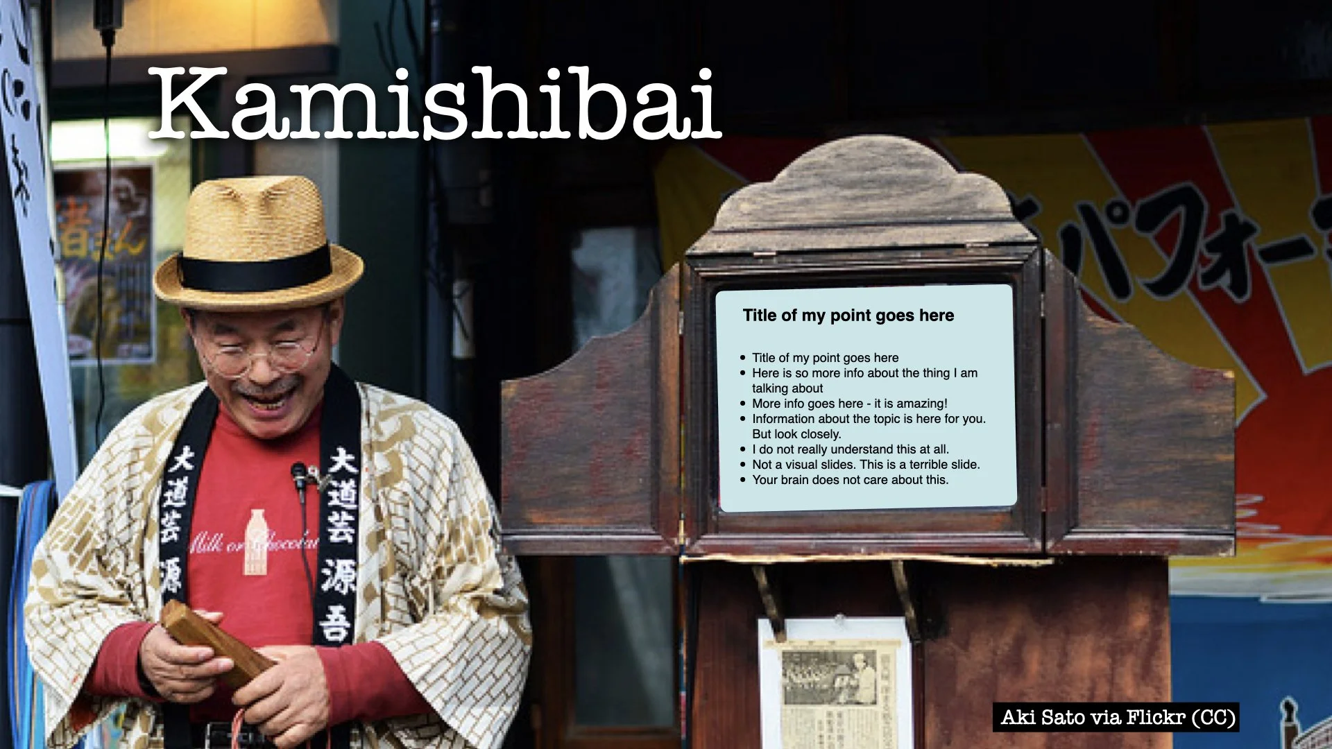 Although Kamishibai is a form of visual storytelling that originated more than eighty years ago, with roots that go back centuries in Japan, the lessons from this craft can be applied to modern multimedia presentations. Tara McGowan, who wrote The Kamishibai Classroom, says that Kamishibai visuals are more like the frames from a movie. “Kamishibai pictures are designed to be seen only for a few [moments], so extraneous details detract from the story and open up the possibilities of misinterpretation." It's important to design each card, she says, "...to focus the audiences attention on characters and scenery that are most important at any given moment." If your material includes a great deal of detail that can not be eliminated, then Kamishibai may not be a suitable method to tell your story, McGowan says. But if "clarity and economy of expression are the goals, it would be hard to find a more perfect medium." It’s easy to imagine how we can apply the same spirit of kamishibai to our modern-day presentations that include the use of multimedia and a screen.