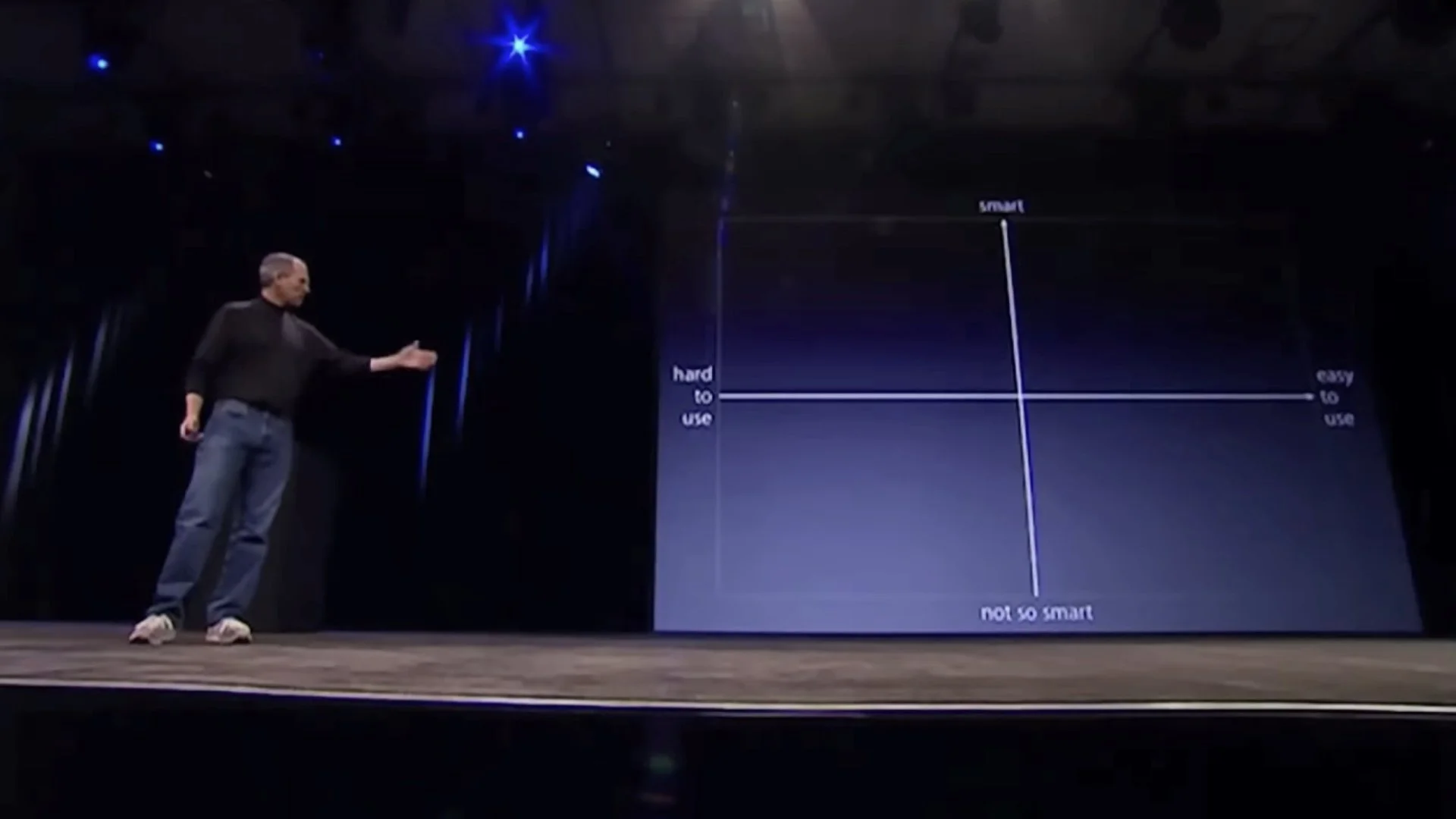 This 70-second segment features a simple positioning-matrix chart that illustrates Jobs’s point (that smartphones at that time were neither very smart or easy to use). Using a simple chart like this aligns with John Sweller’s Cognitive Load Theory and Richard Mayer’s multimedia principle, which suggest presenters can make their narration more effective by pairing it with clear, relevant visuals, which help to reduce extraneous cognitive load on the audience. On the other hand, slides which contain loads of text that essentially repeat the spoken narration—or even expand on the narration—are far less effective. When you present with visuals—diagrams, charts, images—your audience learns more effectively when you speak the explanation rather than asking them to read text on the screen while processing the image simultaneously. Also, when you speak while showing a visual, you're distributing the cognitive load across two independent channels: auditory (your words) and visual (the image). But when you crowd the slide with both images and text, you force everything through the visual channel alone.