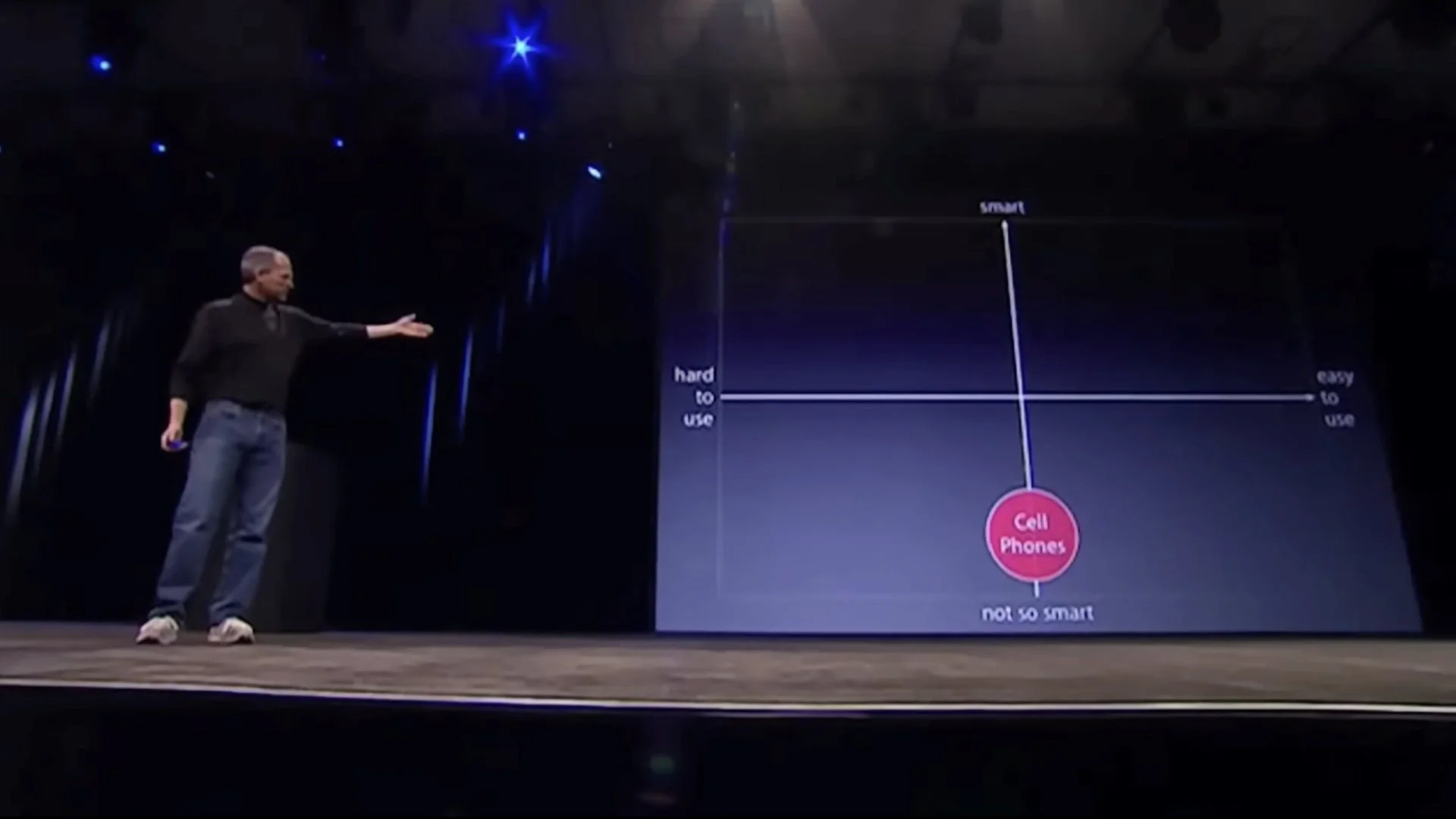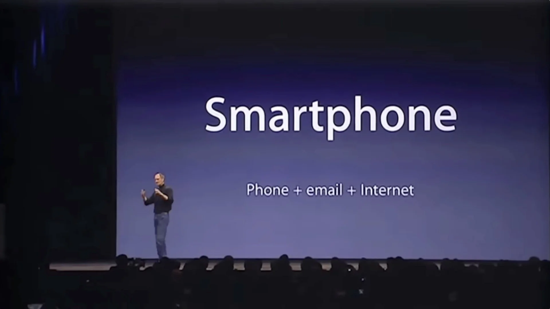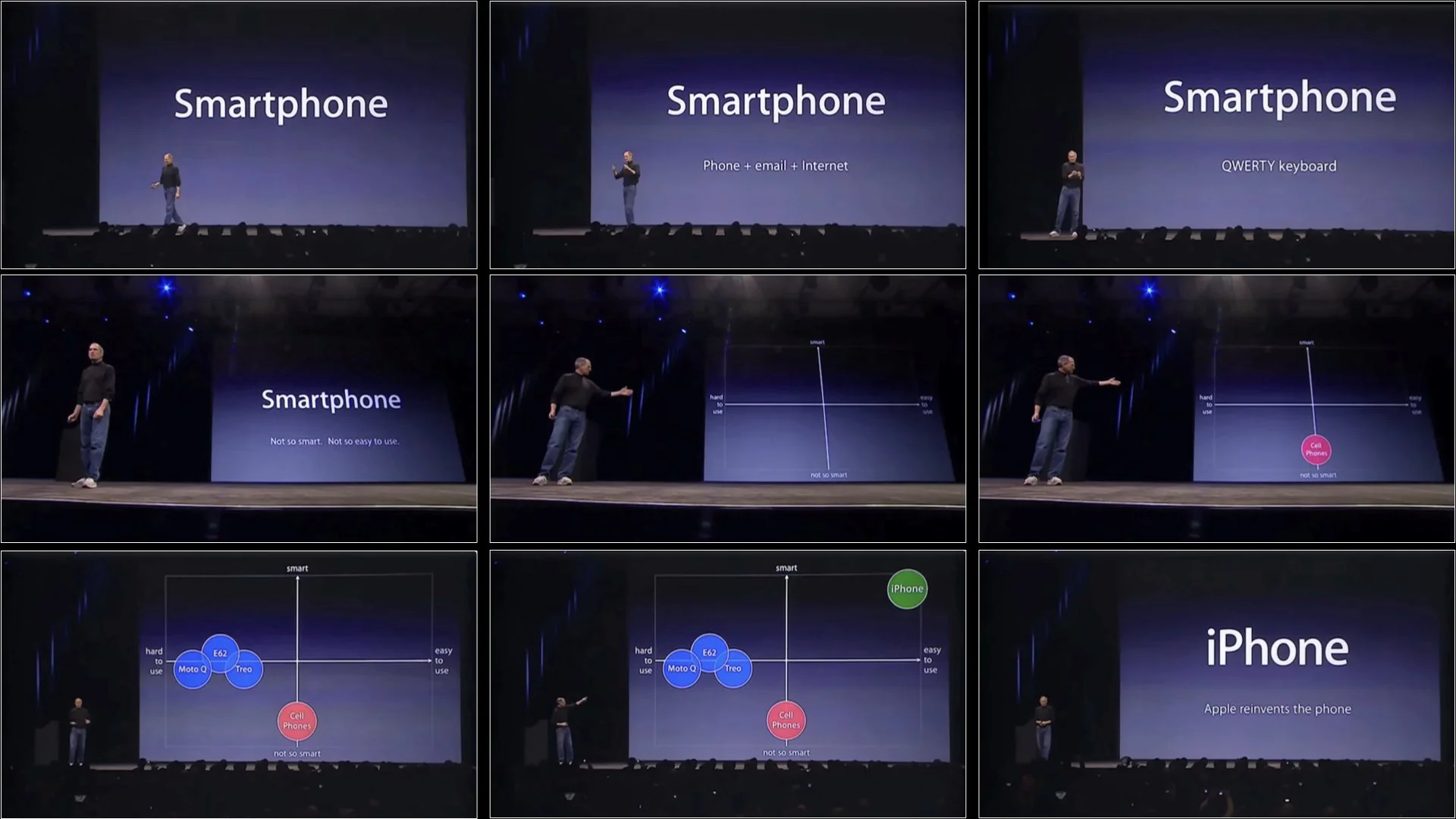 Steve Jobs’s 2007 iPhone introduction keynote was one of his best. In the early part of the presentation, there is a 70-second portion that illustrates how using simple visuals—such as a clear chart—rather than bullet points can amplify the presenter’s message and make it easier for the audience to understand and to remember the core points. Over the short 70 seconds, the visuals on the screen changed nine times over three different slides. So in effect, nine different screens appear if you count the animation builds. Below is the entire keynote on YouTube. The section I’m referring to begins at 3:27.